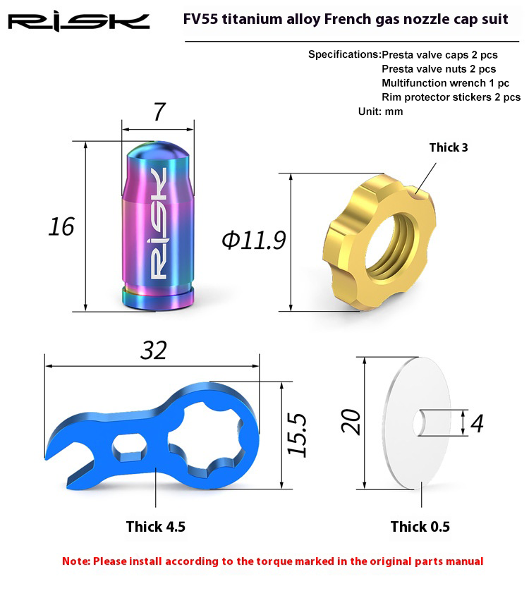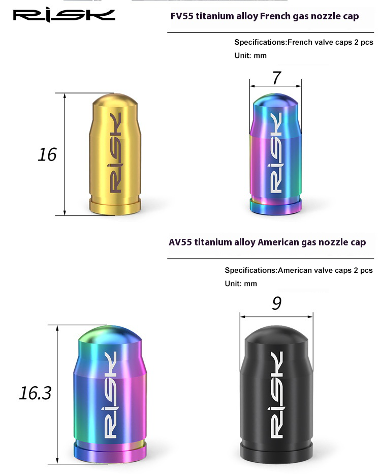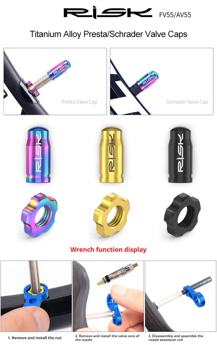 Home»Products» RISK Rarts Bicycle Valve Caps for Mountain and Road Bikes Titanium Alloy Presta and Schrader Valve French and American Dust Covers Nut and Cap FV55/AV55