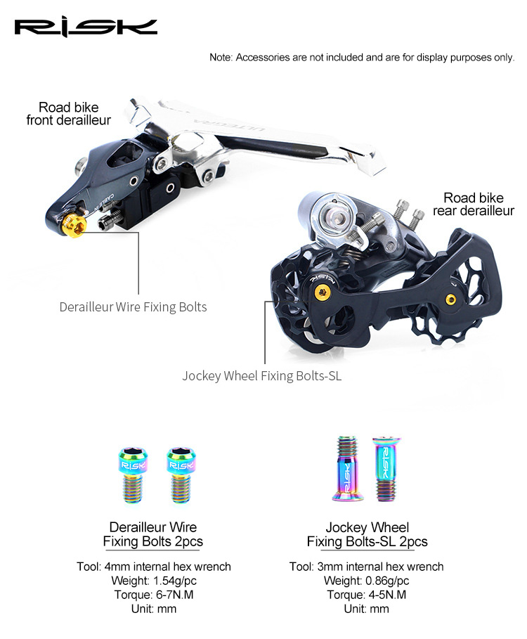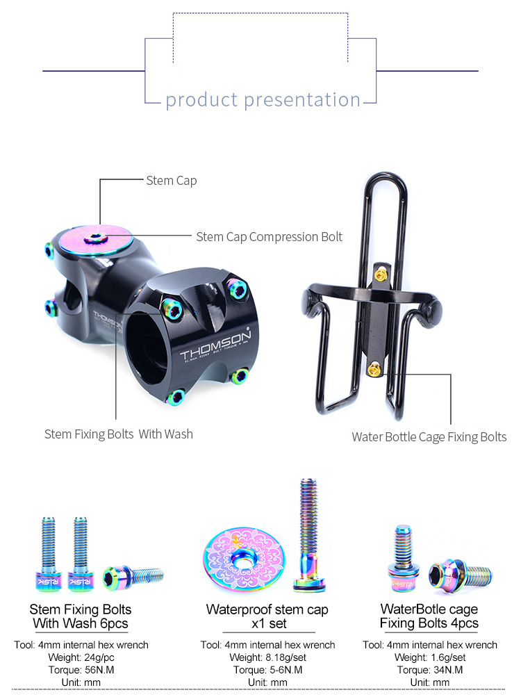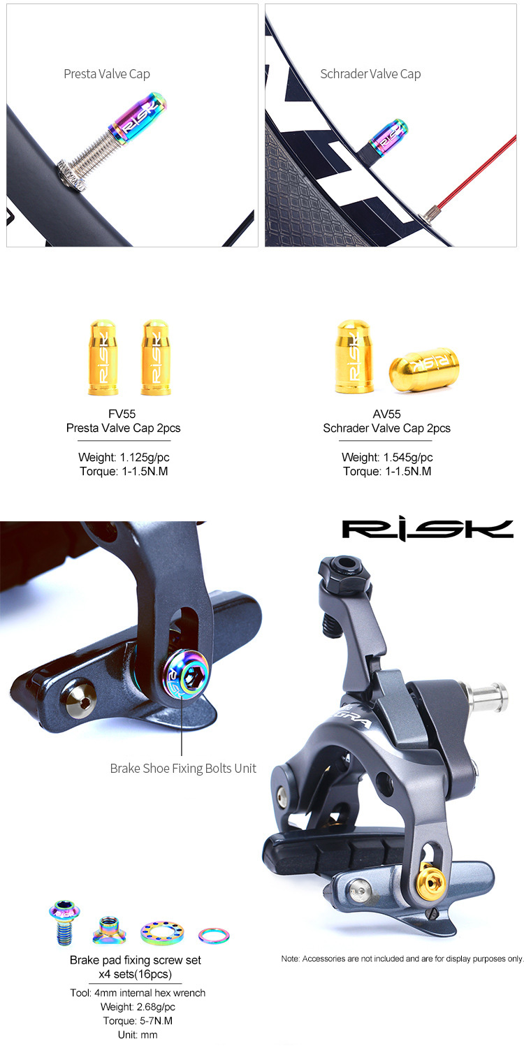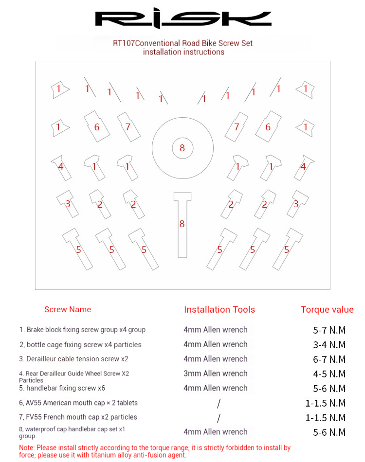 Description: This set includes commonly used screws for road bikes, such as handlebar caps, handlebar fixing screws, C clamp brakes, bottle cage screws, valve caps, and more. Suitable for conventional road bikes, but compatibility with every piece cannot be guaranteed. Please carefully measure the original screw specifications before purchasing and installing. Install according to recommended torque values! Do not force installation!