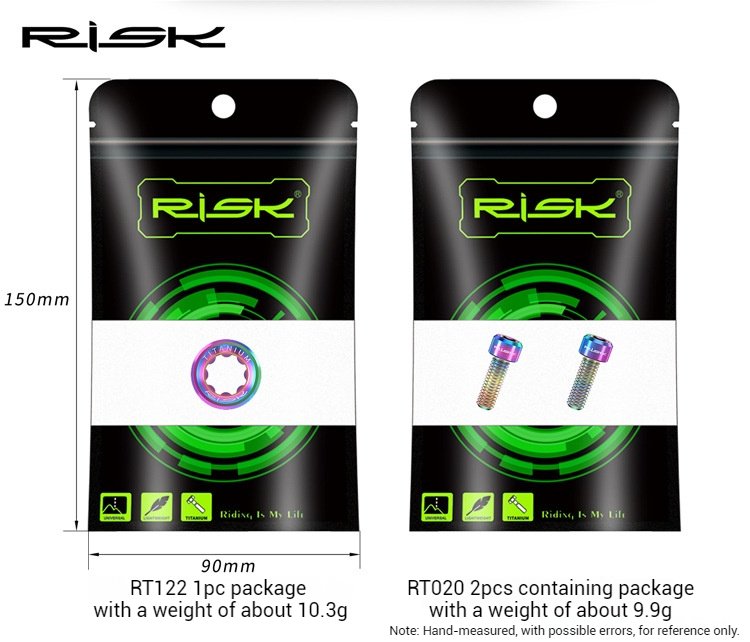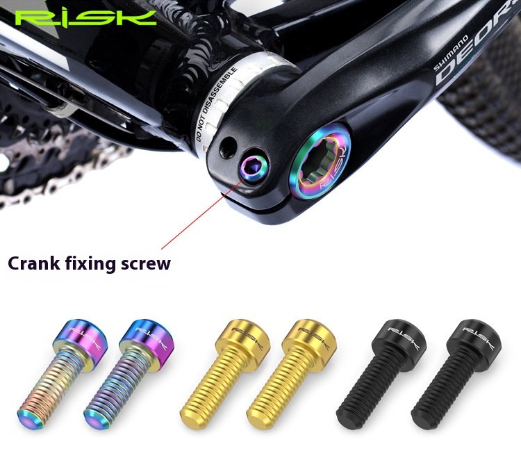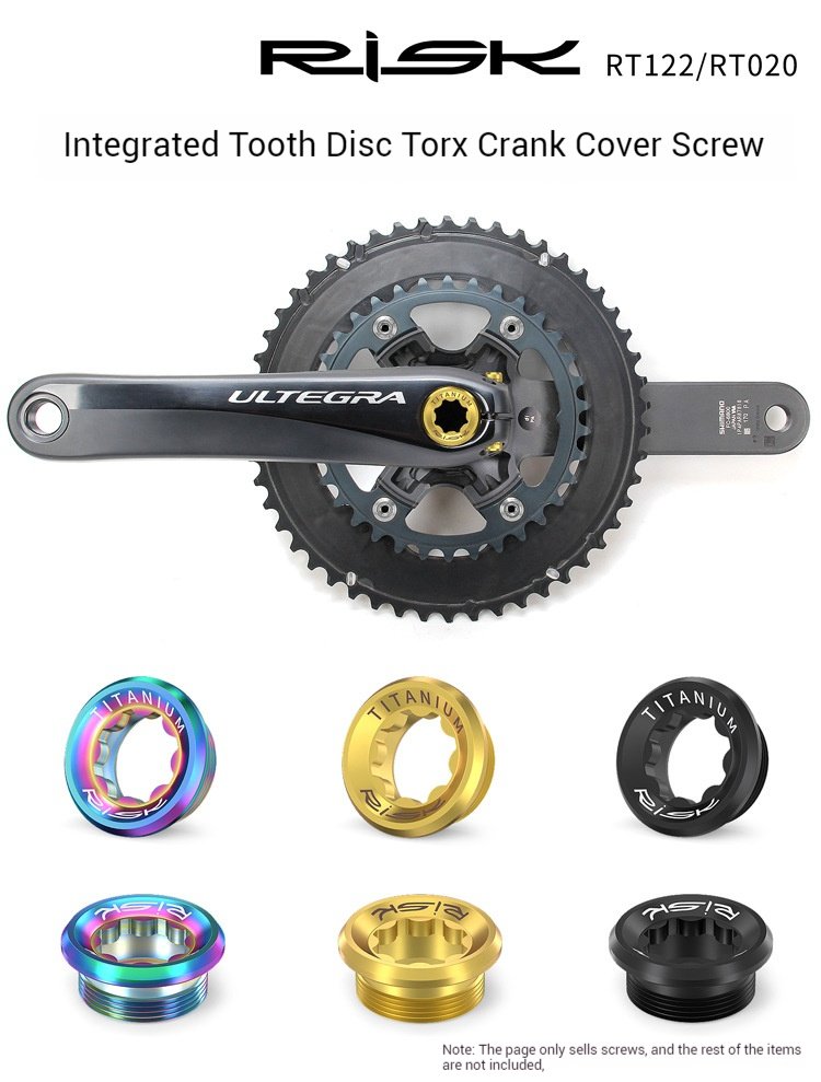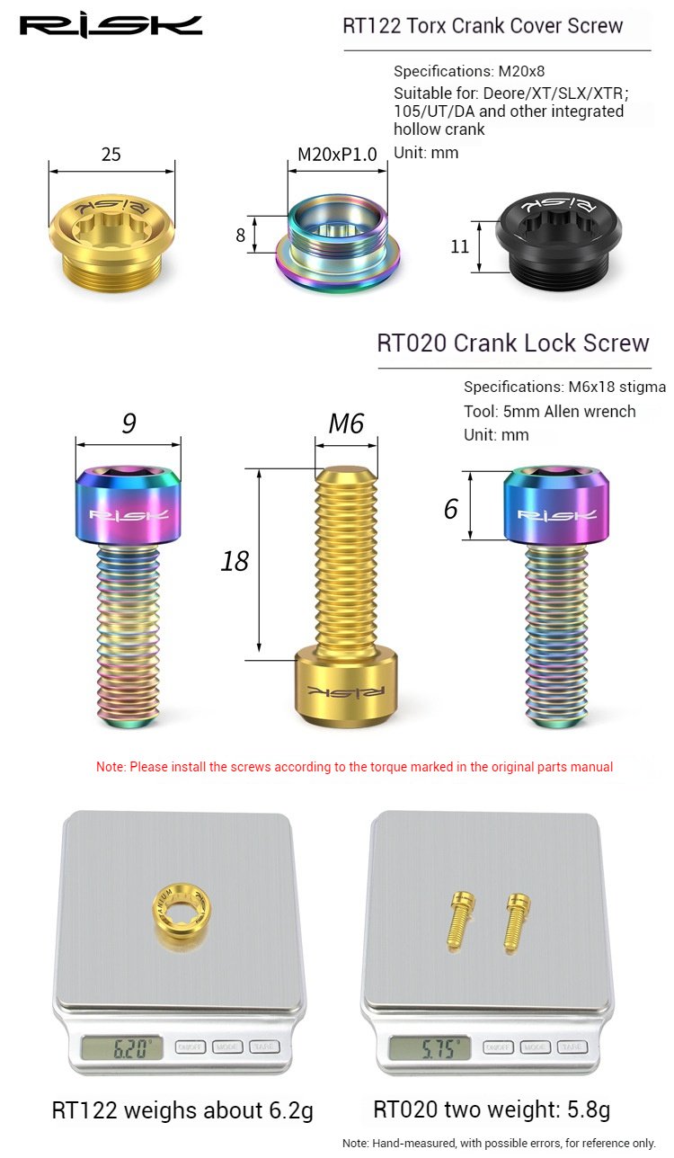 Brand: RISK Material: Titanium Alloy Model Numbers: RT122/RT020 Specifications: M20 Crank Cover Screw: Application: Compatible with XT/XTR/SLX/Deore integrated hollow cranks Packaging: 1 pc/set, branded bagged Net Weight: Approximately 6.2g Gross Weight: Approximately 10.3g M6*18 Crank Screw: Packaging: 2 pcs/set, branded bagged Net Weight: Approximately 5.8g Gross Weight: Approximately 9.9g Packaging Dimensions: Approximately 15*9*1cm